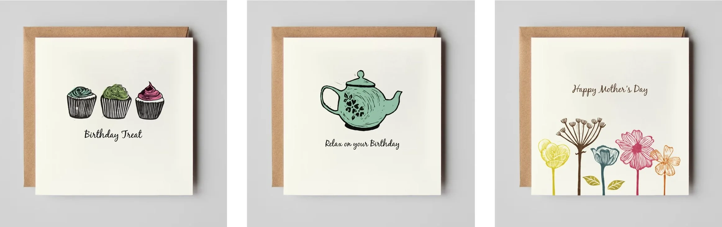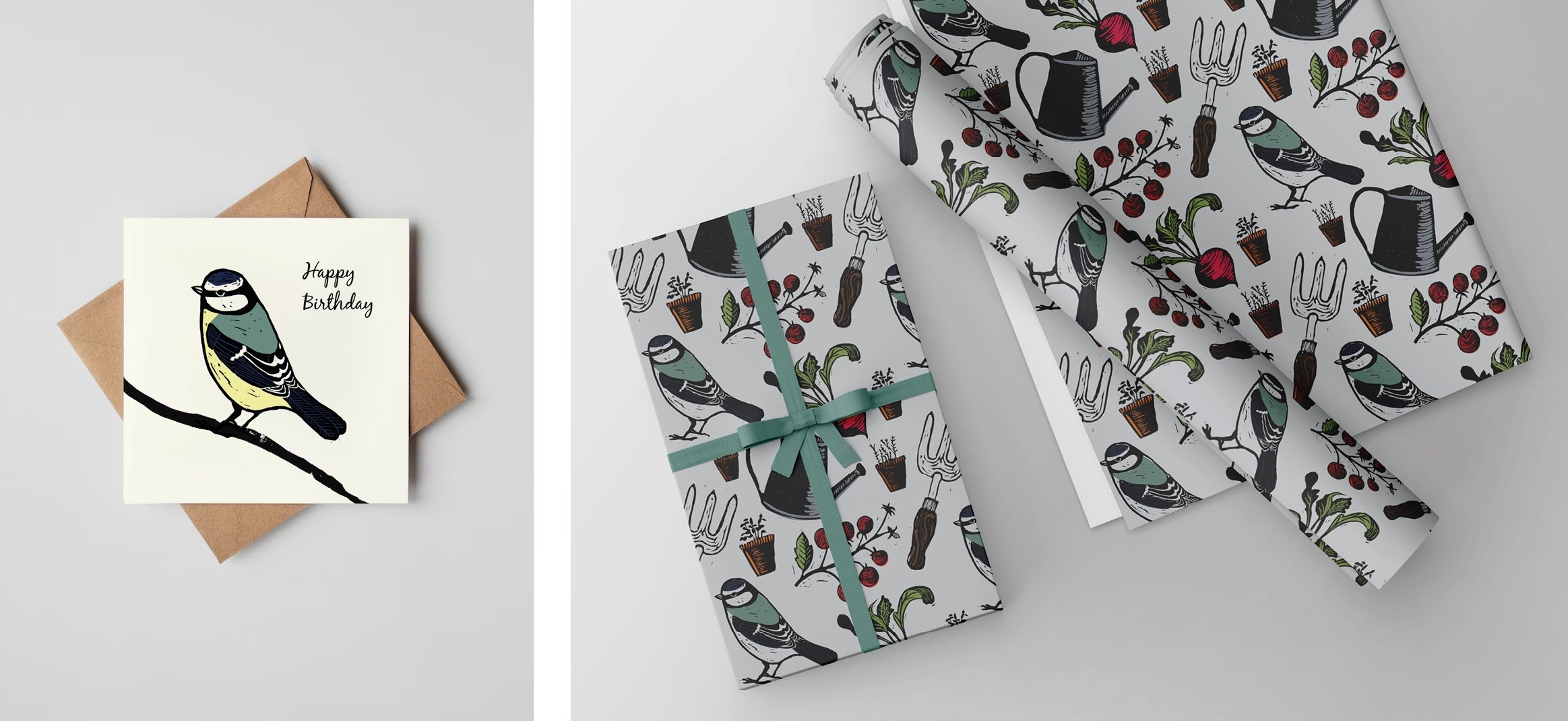 Contemporary greeting card and wrapping paper range for Hallmark Cards using linoprint artwork.